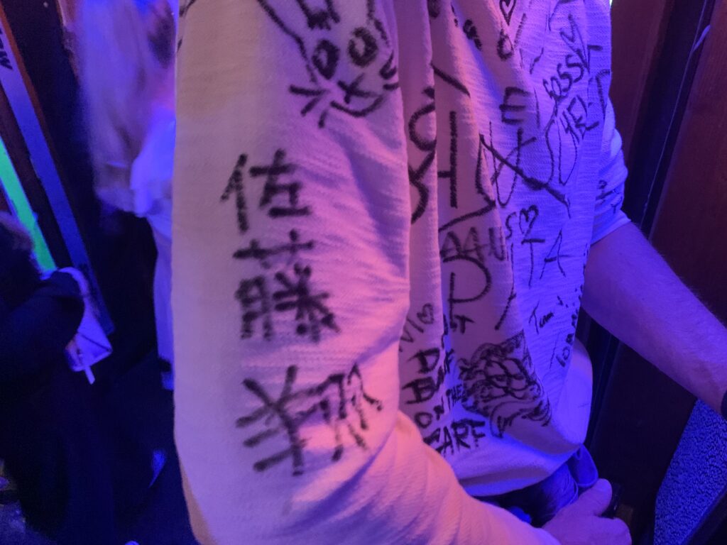 また、いろんな人と話しているうちに、そのうちの一人になぜかTシャツにサインを求められたので自分の名前を書いてみました。